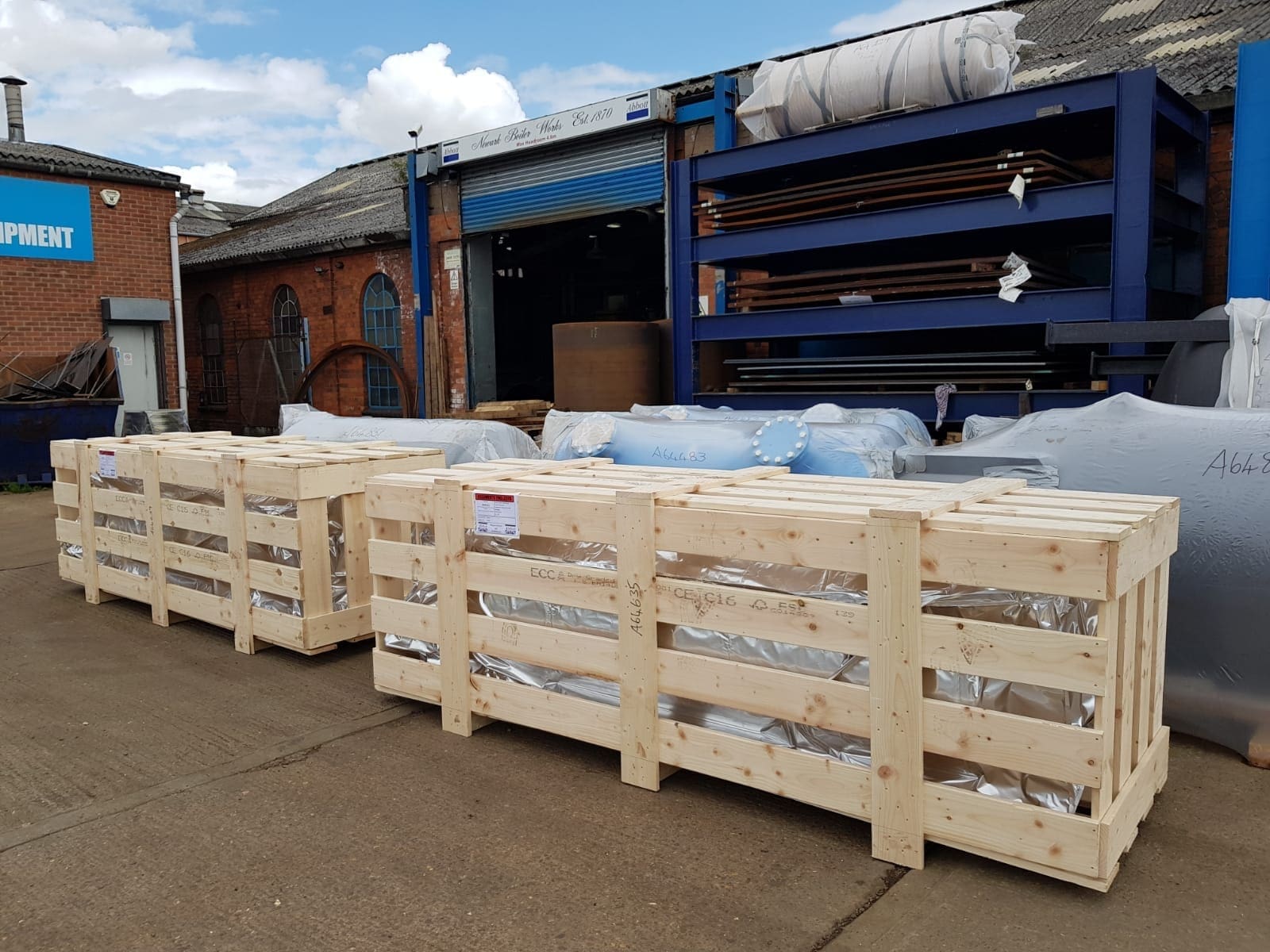 Above Pressure Vessels foil wrapped and crated on site by us and ready for delivery. These are horizontally semi-sheathed crates, externally battened.